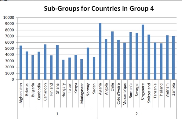 The lowest revenue cluster is number 4. Look in Figure 2. It has a broad number of countries. See figure 4.